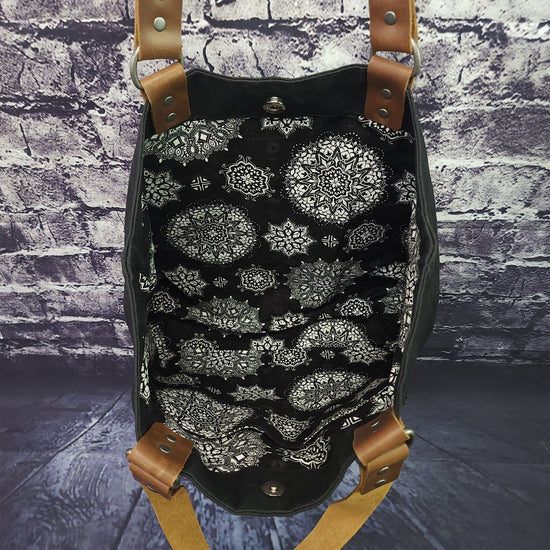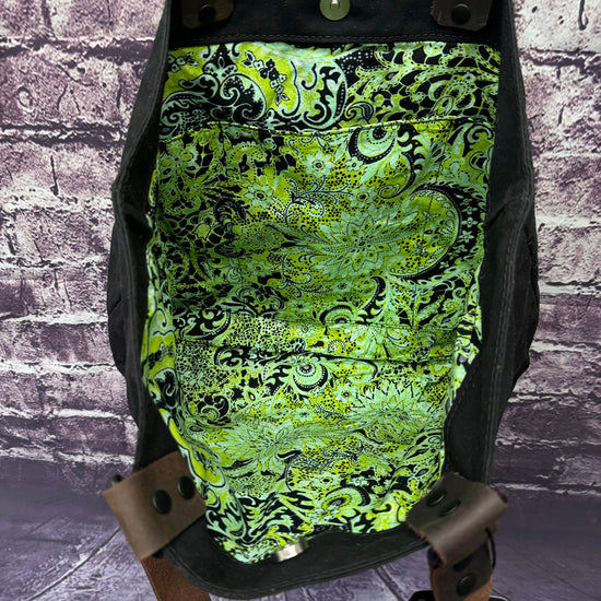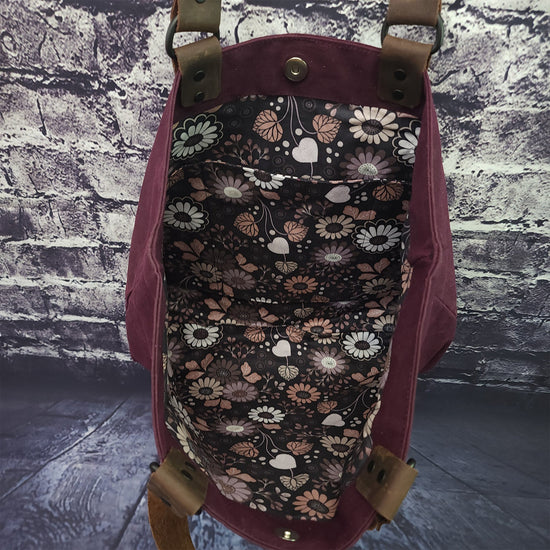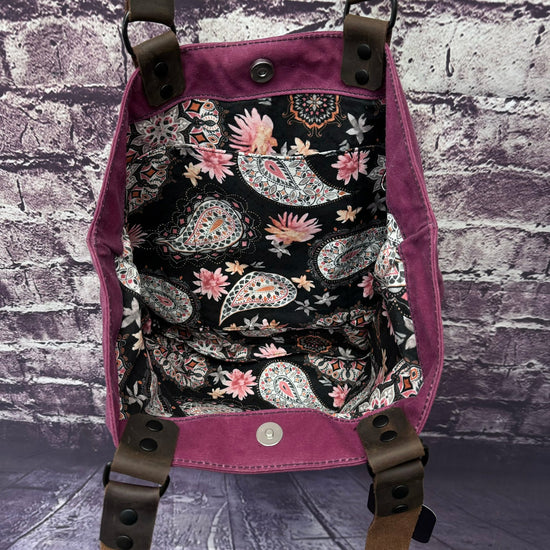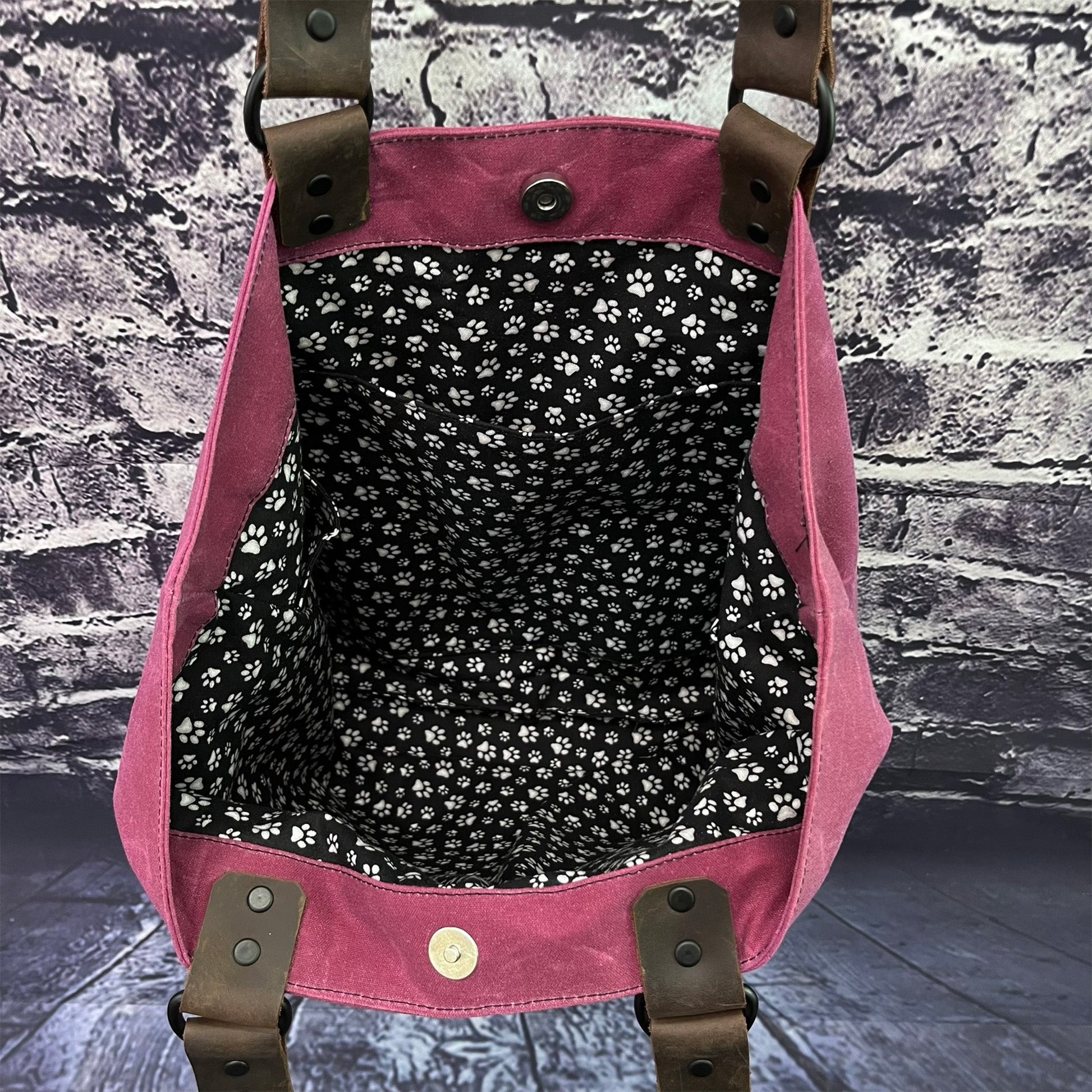 Plum Canvas/Purple flower print lining/Dark brown leather/Black hardware, Berry canvas/Paw prints lining/Dark brown leather/Black hardware, Berry canvas/Pink paisley lining/Dark brown leather/Black hardware, Black canvas/Yellow and black print lining/Dark brown leather/Black hardware, Black canvas/Black and white print lining/Light brown leather/Nickle hardware, Olive Drab canvas/Bee print lining/Light brown leather/Nickle hardware, Sapphire Blue canvas/Turquoise and green print lining/Dark brown leather/Black hardware, Stone canvas/Pale blue paisley print lining/Dark brown leather/Nickle hardware, Merlot canvas/Black and pink geo print lining/Dark brown leather/Nickle hardware, Deep Sea canvas/Blue feather print lining/Dark brown leather/Black hardware |