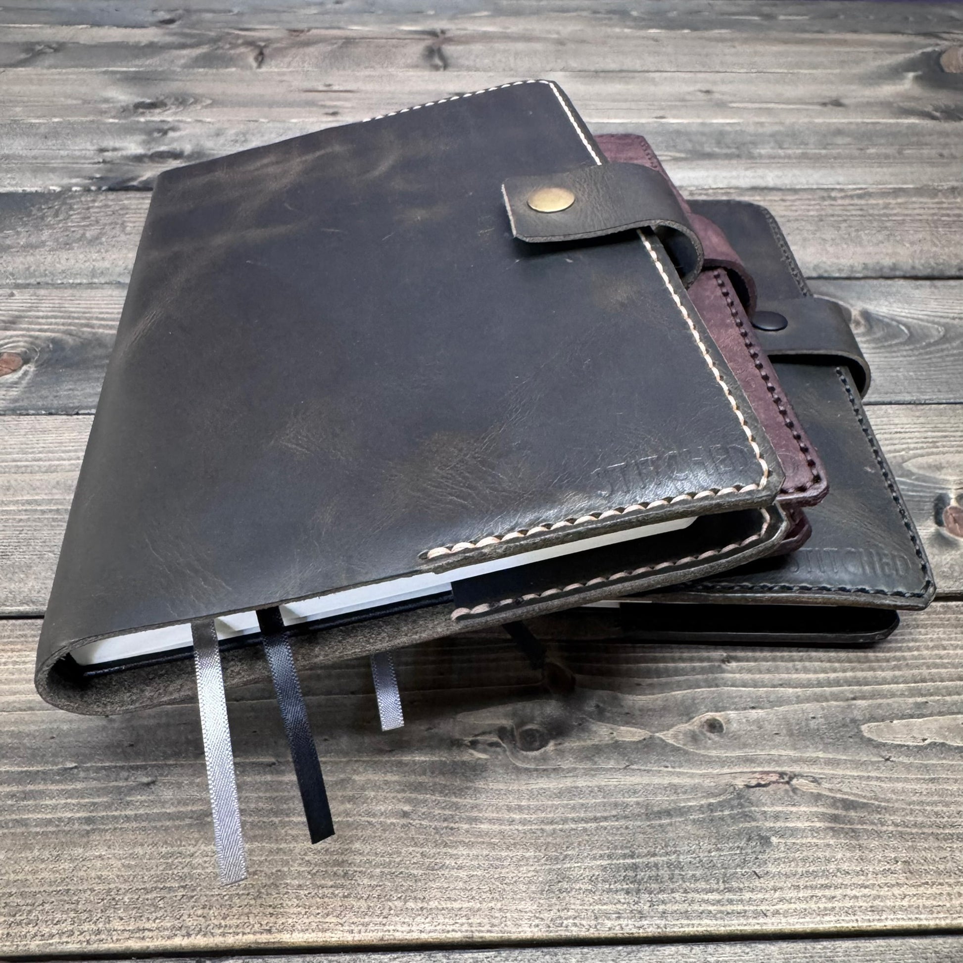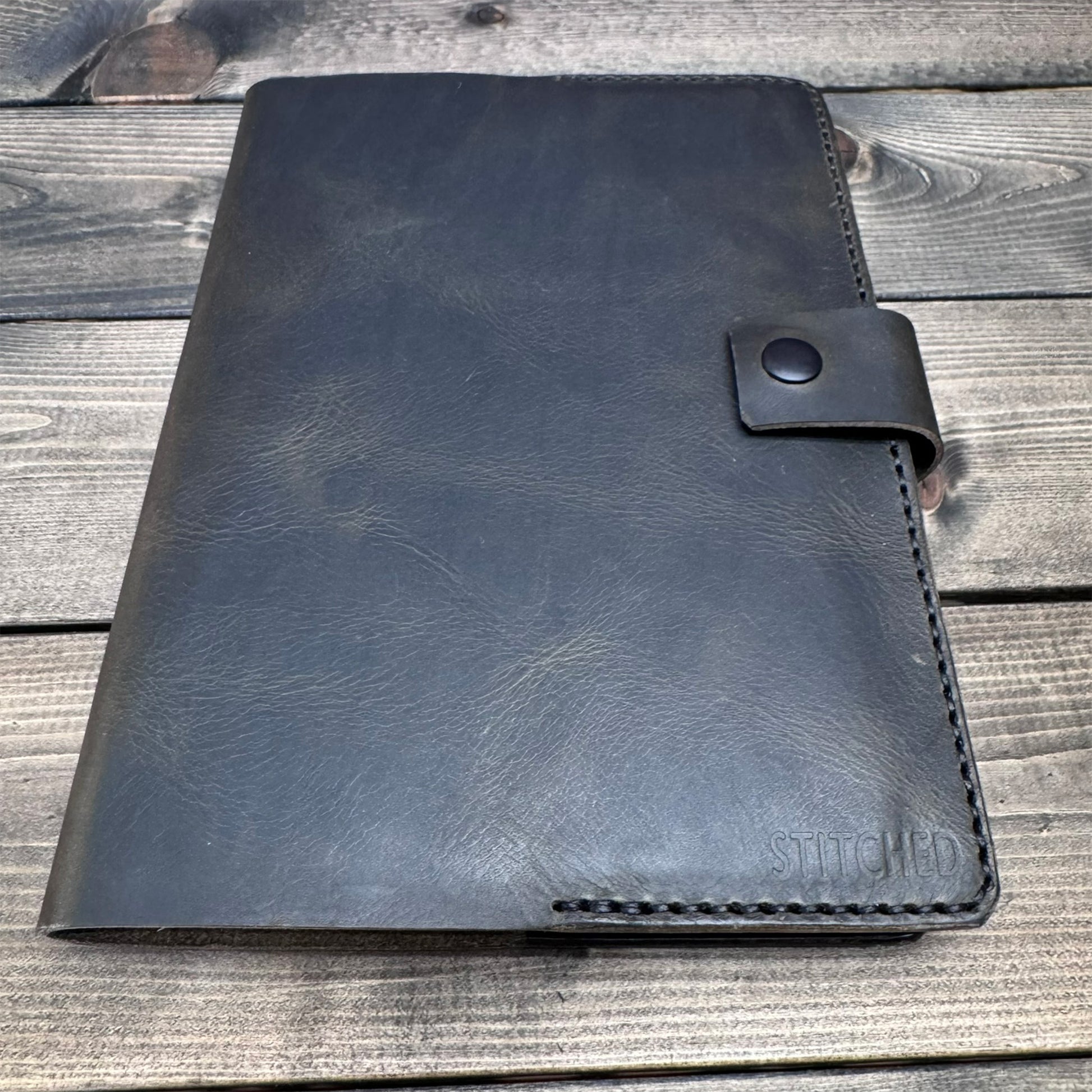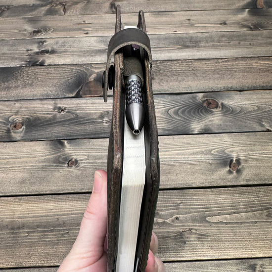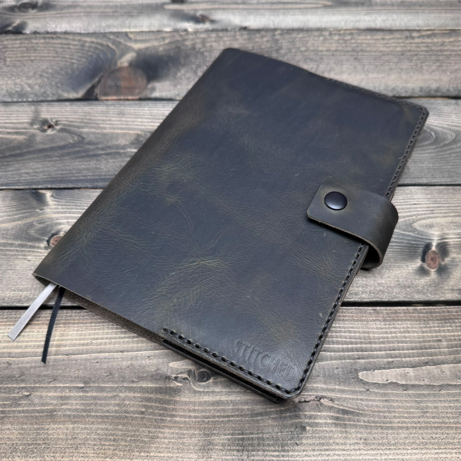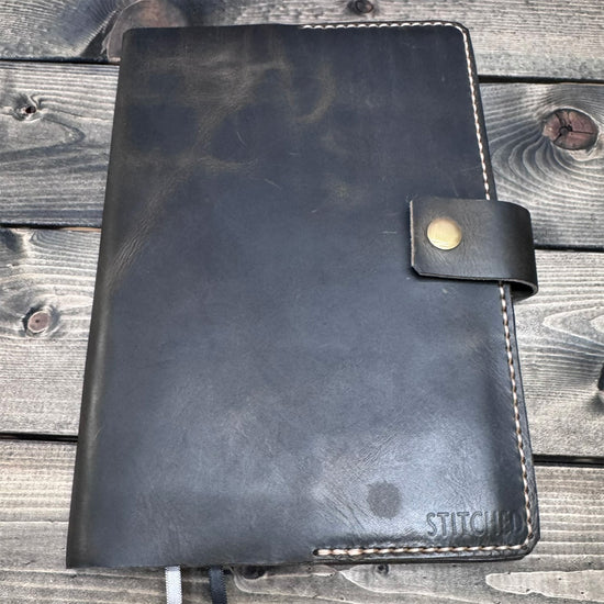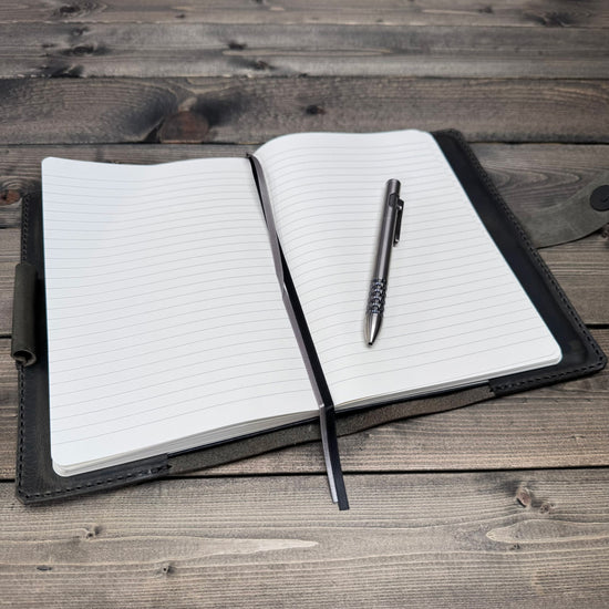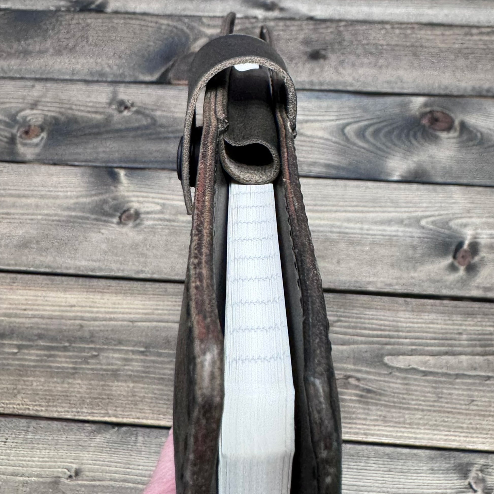 Designed to fit an A5 notebook (included), this cover combines rugged durability with classic style, perfect for writers, planners, and creatives on the go. A secure magnetic snap closure—available in your choice of Black or Antique Brass—keeps everything in place, while a convenient pen loop ensures you're always ready when inspiration strikes.